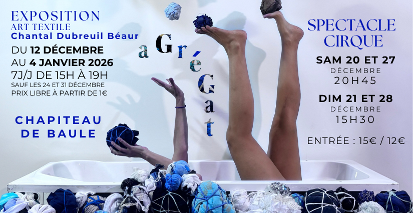 À Baule, les fêtes s’illuminent avec aGréGat, une installation-spectacle unique imaginée par l’artiste balgentienne Chantal Dubreuil Béaur. Sous le chapiteau de L’Embouchure, une macro-installation textile changeante et éphémère sert d’écrin à une fresque vivante mêlant cirque, danse, théâtre et musique.