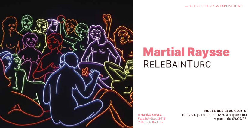 À partir du 9 mai 2026, le Musée des Beaux-Arts dévoile un nouveau parcours consacré à la période 1870 à aujourd’hui, avec quatorze salles entièrement repensées et de nombreuses œuvres sorties des réserves ou récemment acquises. Au cœur de cet accrochage, l’artiste Martial Raysse s’impose avec le prêt exceptionnel de ReLeBainTurc (2013), monumental diptyque en néon de onze mètres de long inspiré du célèbre Bain turc de Jean-Auguste-Dominique Ingres. En réinterprétant ce chef-d’œuvre à travers une esthétique pop et lumineuse, Raysse ne se contente pas de le citer : il le transpose dans notre époque et crée un dialogue puissant entre les siècles et les courants artistiques.