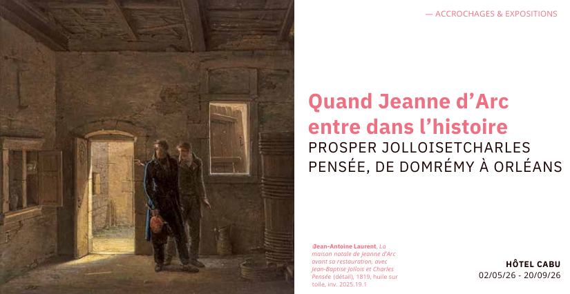 Du 2 mai au 20 septembre 2026, l’Hôtel Cabu consacre une exposition à un moment clé de la redécouverte patrimoniale de Jeanne d’Arc. En 1819, l’archéologue Prosper Jollois et le dessinateur Charles Pensée sont envoyés à Domrémy pour évaluer la maison natale de Jeanne d’Arc. Leur émotion face au lieu marque symboliquement l’entrée de l’héroïne dans l’Histoire nationale. Le peintre Jean-Antoine Laurent immortalise cette scène dans un tableau récemment acquis et présenté pour la première fois au public. L’exposition éclaire également le rôle décisif de ces chercheurs à Orléans, devenue au XIXe siècle un centre majeur des études johanniques.
