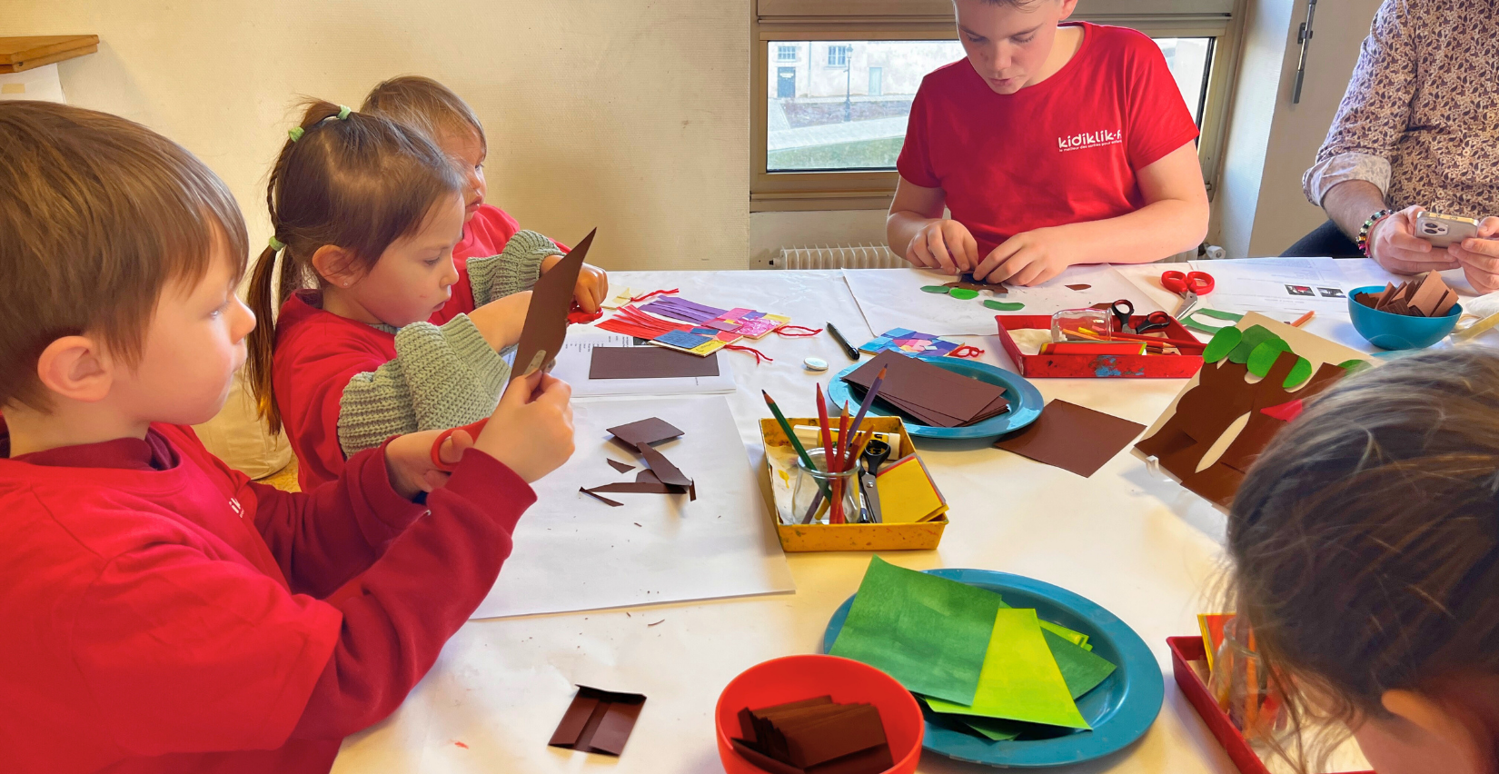 Emma, 4 ans, applique soigneusement la colle sur de petits carrés de papier. Concentration maximale. Ethan découpe avec application et annonce qu’il veut “tout faire”.